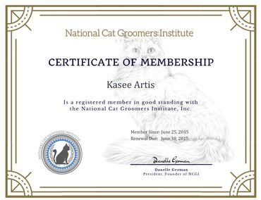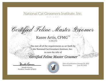 With almost a decade of grooming experience, she prides herself in sharing her love and knowledge of cat grooming with her clients and friends alike. In January of 2016, she received her education from The National Cat Groomers Institute and became Arizona's 6th Certified Feline Master Groomer.